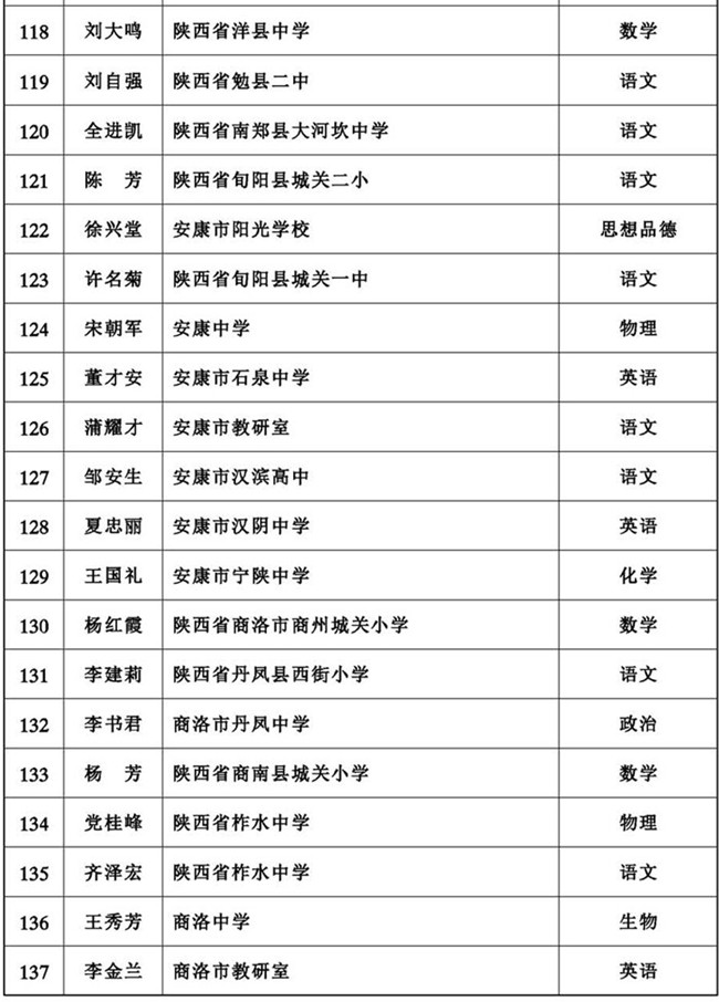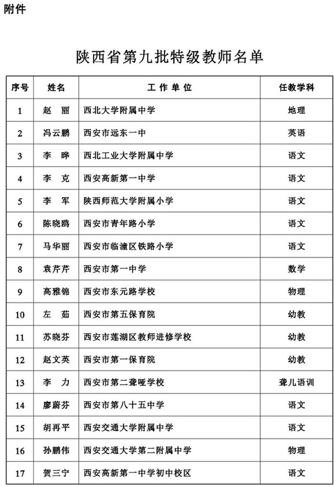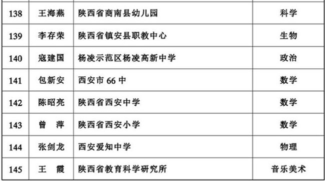 教师是教育事业发展的基础,是提高教育质量、办好人民满意教育的关键。为促进建成一支师德高尚、业务精湛、结构合理、充满活力的高素质、高水平教师队伍,在全省形成尊师重教的良好风尚,努力推进教育强省建设,根据国家有关规定,省政府决定,授予赵丽等145名同志陕西省特级教师称号(第九批)。