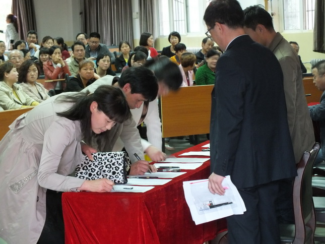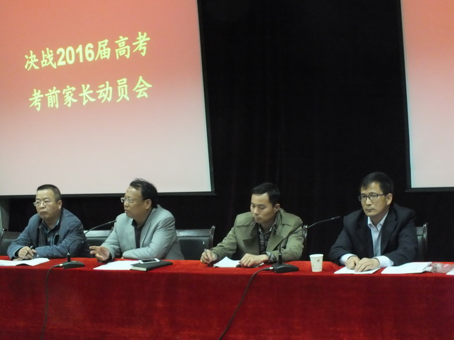 4月20日晚七点,高三年级组“决战2016届高考——考前家长动员会”在我校多功能厅举行。会议由高三年级组长张满户主持,高中教务处王旭主任、政教处徐恒明副主任、高三年级组长李憬波及高三学生家长参加了会议。