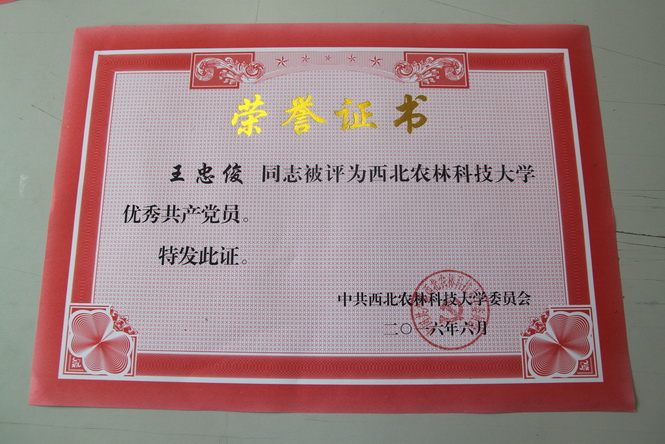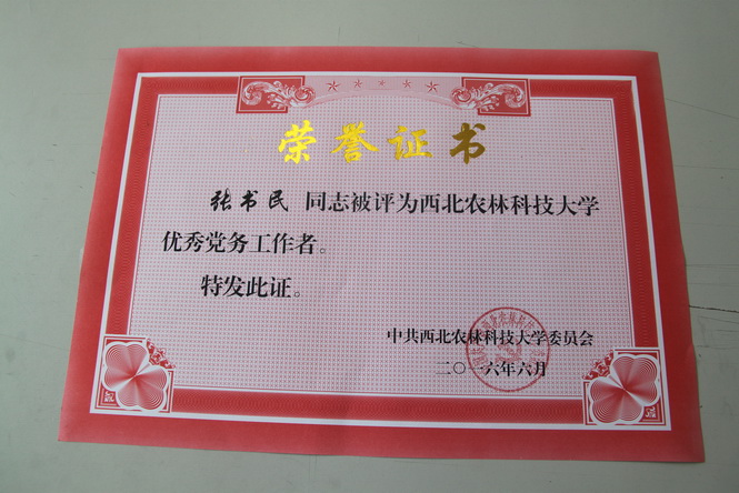 日前,在西北农林科技大学党委评选的优秀基层党组织、优秀共产党员和优秀党务工作者活动中,我校第四党支部被评为“先进党支部”,张书民副校长被评为“优秀党务工作者”,王忠俊主任被评为“优秀共产党员。
