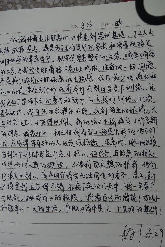 军训过程中体力训练是一部分,充分了解学生的内心感受,增强师生互动也显得尤为重要。每天都给学生固定的时间书写日记,表达每一天军训的内心感受,班主任老师在读学生日记的过程中了解学生的心理,对学生进行及时的鼓励,让本次军训在他们的笔端,更在他们的心里留下印记。
