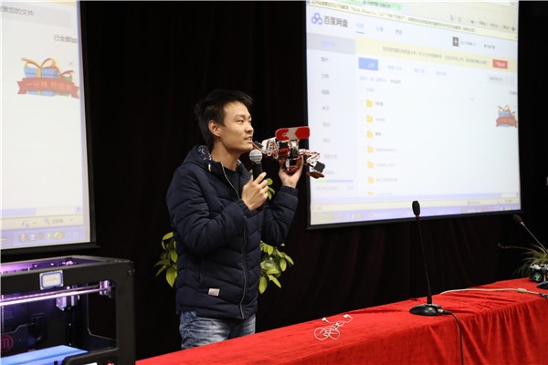 机电学院刘鹏同学为大家首先带来的是神奇的3D打印机。他用烧制瓷器的原理深入浅出地阐释了3D打印机的基本原理,并为大家展示了打印机打印出的作品。这些城堡、怪兽等工艺精巧、栩栩如生。其中一个会跳舞的机器人,让同学们的热情高涨、掌声不断。接着,机电学院学生又为我校同学播放了各项大型科技成果的视频,会踢足球的机器人引起了同学们的兴趣,他们聚精会神地观看,不时地发出笑声。在讲座的互动环节,同学们争相回答问题。最后,机电学院同学们将3D打印的物品赠送给了我校同学,并鼓励他们好好学习,如有兴趣可以到机电学院的实验室,一起学习交流。