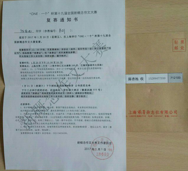 我校学生陈杏池获得新概念作文决赛资格