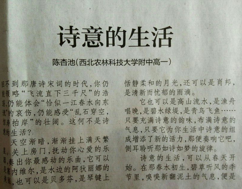 陈杏池是我校高中一名学生,对文学创作兴趣浓厚,从高一开始大量阅读与写作,每周她都坚持完成500字左右的阅读精华文句摘抄,寒暑假从未间断。良好的阅读习惯与厚实的积累,让她写作的自信心增强,2016年6月,陈杏池同学参加“语文报杯”全国作文大奖赛,以一篇《行·思》获得全国三等奖。2016年9月,在《西安晚报》发表《诗意的生活》一文,凤凰网进行了转载。2016年11月,陈杏池以一篇《望远镜》参加全国新概念作文大赛,最终成功进入决赛。