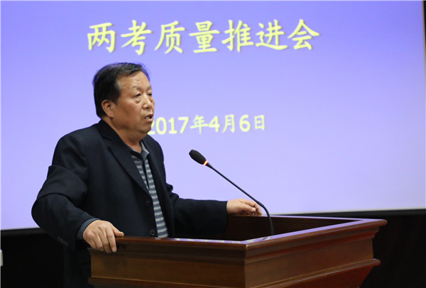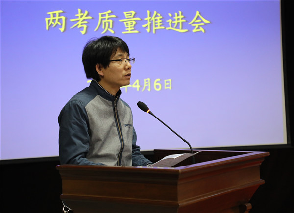 王常劳校长感谢了全体教师所做的努力。他再次强调,“质量是学校的生命线”。在年初提出的“五大工作任务”中,其中的重要一项就是教育教学质量的提高。为此,他要求:一、要高度重视“两考”工作;二、初三、高三师生要从大局出发,完成学校赋予自己的历史责任;三、强化合作、保障工作,教师要扎实、细致地做好后期复习,各部门要为师生做好服务工作。