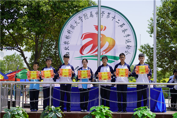 本届运动会共有35支代表队参赛。经过激烈角逐,初一8班等13个班级获得团体奖,初一6班等8个班级获“精神文明班级”称号,王常劳校长、李筱英书记、韩党卫副校长、张书民副校长为获奖班级颁奖。