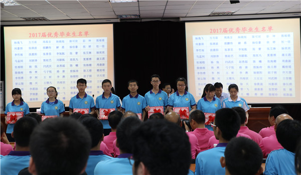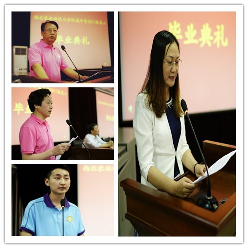 毕业典礼在庄严的国歌声中拉开帷幕。高中教务主任王旭宣读毕业鉴定,李筱英书记宣读《关于表彰2017届高三优秀毕业生的决定》。王常劳校长等校领导为学生代表颁发了毕业证,并为何嘉琪等77名优秀毕业生颁发了奖状。学生代表向李恩良等28名高三教师献上了鲜花。