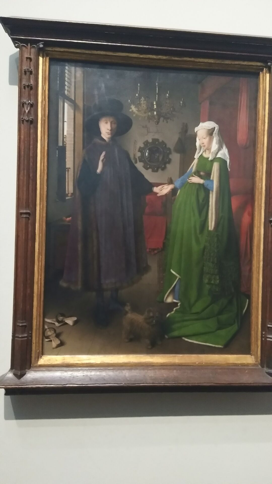 另一副《阿尔诺芬尼夫妇像》,据说,这副奇特的画中蕴含着许多细节,比如说上方的蜡烛一边亮一边灭寓意着生和死,两人中间的小狗意味着忠诚等的含义。其实每副作品之后都有着动人的故事。