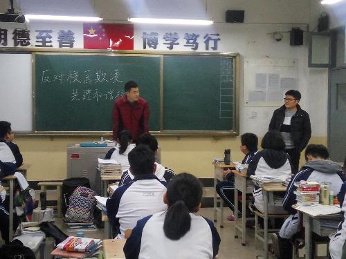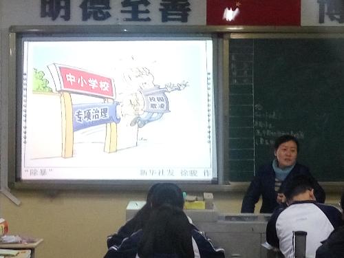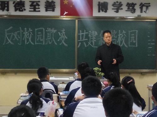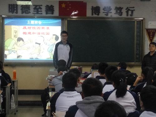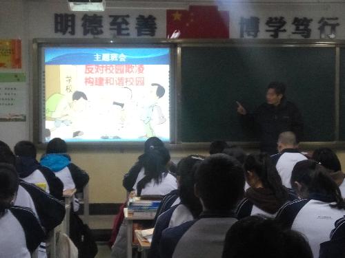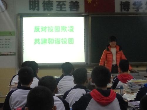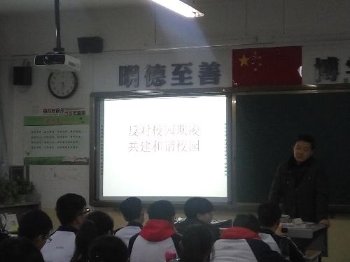 各年级各班利用班会课,进行“反对校园欺凌,共建和谐校园”主题班会专题教育活动。班会课上,各班班主任通过视频播放揭露“校园欺凌”现象以及通过在ppt讲解 “反对校园欺凌”的重要性。促使学生逐步形成正确人生观、价值观和是非观,建立起平等友好互助的同学关系。