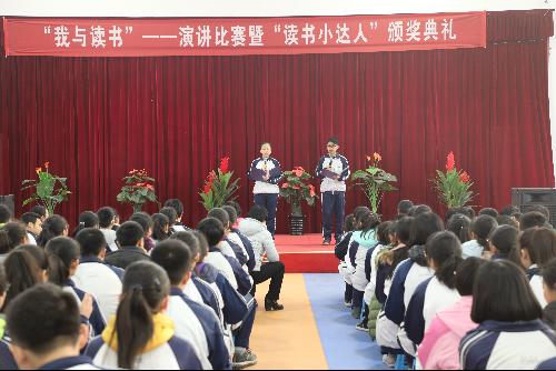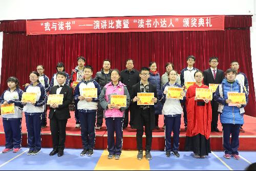 12月27日,我校初三年级在体育馆举行演讲比赛暨“读书小达人”颁奖活动,王联科主任、李玉霞副主任、方凯副主任出席活动并颁奖。