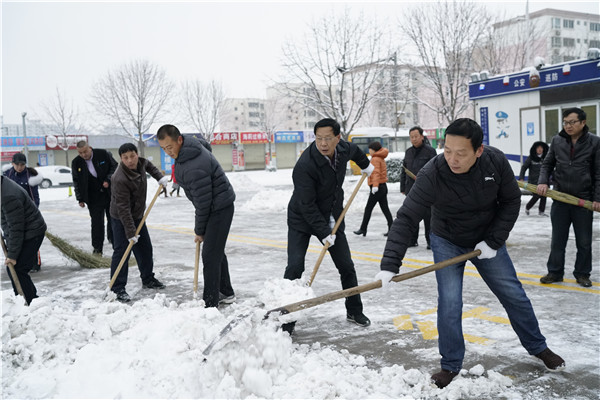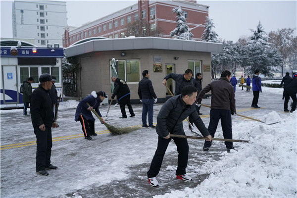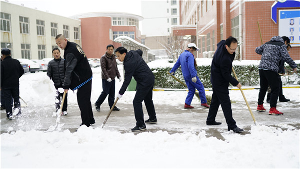 经过一天一夜的降雪,路面积雪已达数厘米。在王常劳校长等校领导的带领下,各处室主任及职工相继投入到扫雪工作中。大家不畏寒冷,用铁锹铲去表面的积雪,用扫把清扫路面,在师生到校前清扫完学校所有道路,保证了师生的活动安全。