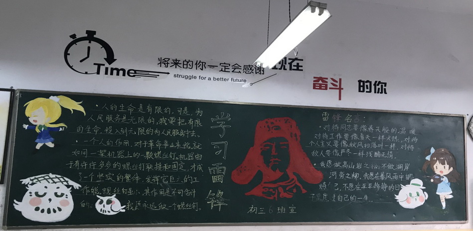 为了加强班级文化氛围建设,充分发挥黑板报的教育作用,提高学生动手能力和审美能力,学校教育处、团委在开学初安排各班办一期以“新学期 新启程 新作为”或“我与雷锋精神同行”为主题的黑板报。各班主任高度重视,班干部积极响应,根据主题组织学生查找资料,精心设计版面,用自己的智慧和双手写下优美的文字、绘出精美的图案、涂上鲜艳的色彩。充分展现了同学们爱班爱校,积极向上的良好集体风貌。