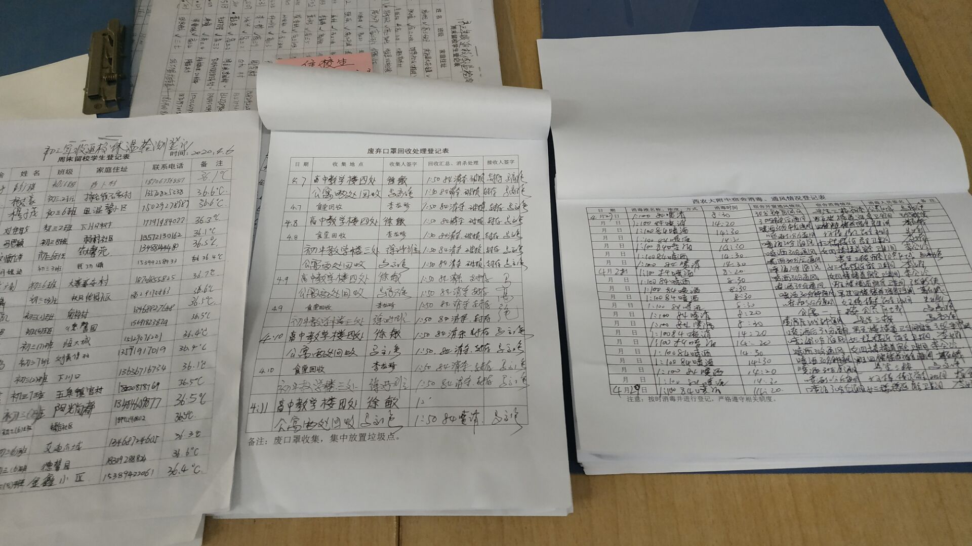 宿舍每天两次按时查宿,三次体温检测。早晨6点40在公寓楼门口安排3人一组测体温,其余2次均在中午、晚自习学生回宿舍查宿时进行测体温,确保不漏一人。落实常规消杀每日2次,消毒后30分钟通风制度,做好记录。指定专人每天将校园回收点的废口罩收集破损后,送公寓点封装,由环卫部门负责清运处理。