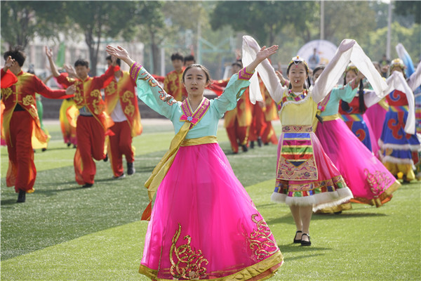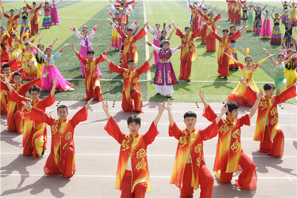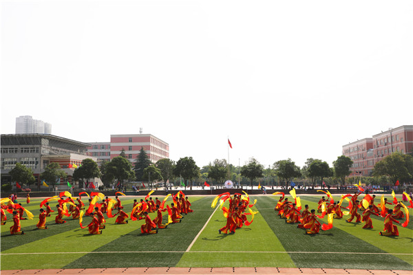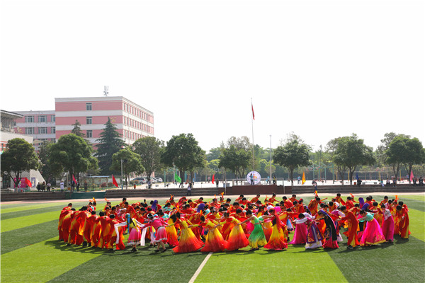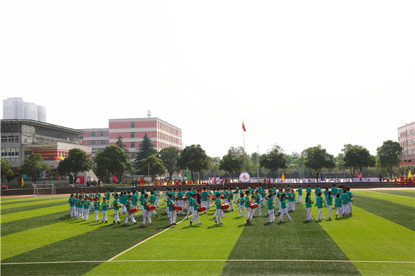本届运动会开幕式文艺表演精彩纷呈,亮点多多。首先进行表演的是锣鼓队。在曹小平老师的带领下,锣鼓队队员节奏鲜明、阵型多变,敲出了气势,敲出了附中的“精气神”!啦啦操队员在《喜羊羊》的背景音乐中,为我们奉上了一场青春动感的表演。他们挥舞着啦啦花,活泼可爱的舞姿尽显中学生的朝气与风采。高一年级的太极拳表演沉着稳重,一招一式都显示出中华传统武术文化的魅力。最令人瞩目的是民族舞表演《爱我中华》。舞者们身穿五彩斑斓、各具特色的民族服装,摆出各种花型,展现出56个民族的团结友爱,赢得了现场观众的阵阵掌声。