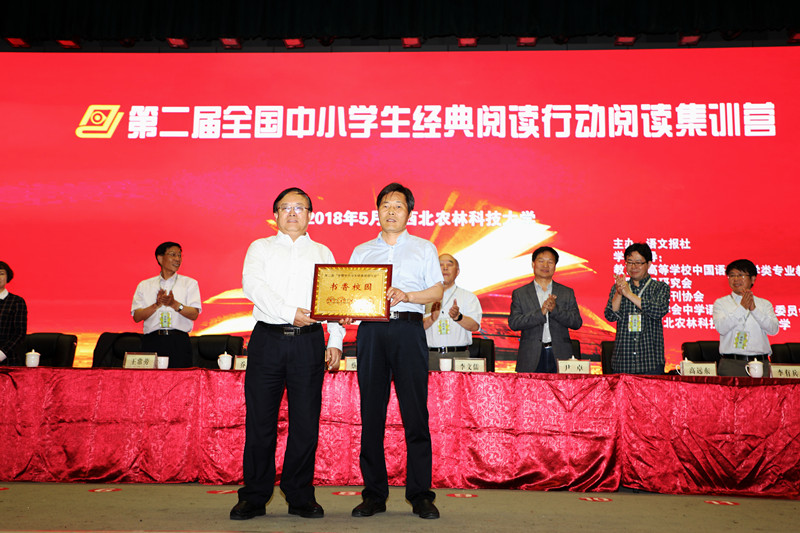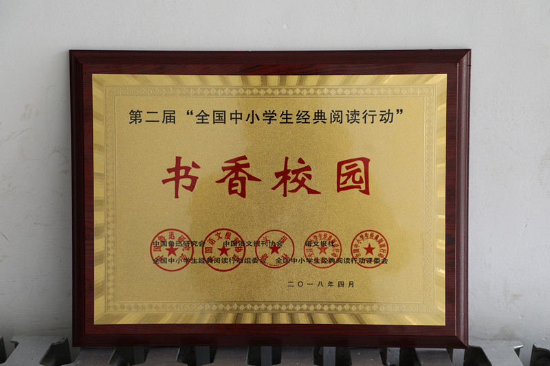 在第二届“全国中小学生经典阅读行动”现场检测暨阅读集训营活动中,我校被授予“书香校园”称号。《语文报》报社社长兼总编辑蔡智敏为我校颁发牌匾,我校党总支书记韩党卫代表学校上台领奖。