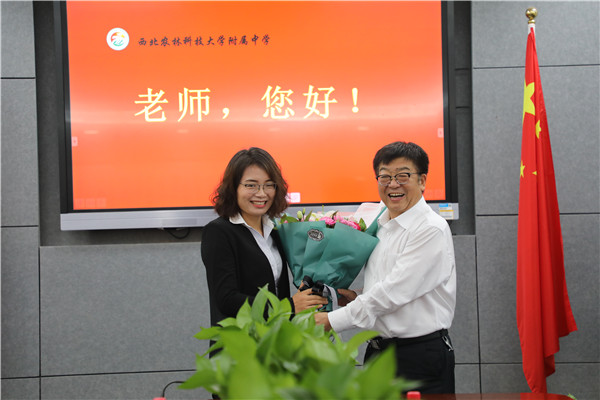 在会议室,吴普特校长为何文艳、张满户两位教师代表送上了鲜花,并为附中全体教师带来了节日的祝福。