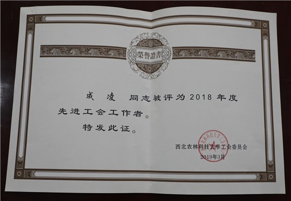 近日,按照西北农林科技大学工会《关于做好2018年度部门工会工作总结的通知》要求,经各部门工会互评推荐和大学工会研究,我校成凌老师荣获“先进工会工作者”称号。