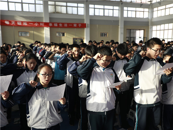 学生代表在精彩发言后,带领初三全体学生庄严宣誓,表达自己决战中考的勇气、信心和艰苦奋斗的决心、意志。