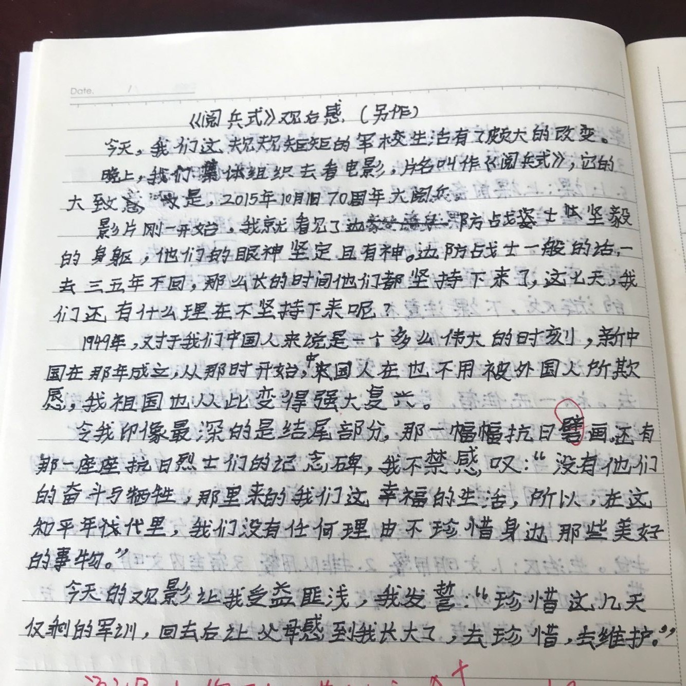 对于自己被分配到女子队列方阵,高一2班的张佳欣同学一开始并不满意。几天的训练下来,张佳欣同学逐渐认识到,每个方队都有自己的价值和使命。她在日记中写道:“作为一名合格的中学生,我们应当积极行使自己的权利,履行应尽的义务……经过四天的训练,我们已经能自如地站军姿、走队列。但是,这远远不够,人生中的漫漫长路才刚刚开始。上一次,我未曾逃避,这一次我定不畏惧!”和她一样,同学们在这里,体会到成长的滋味。