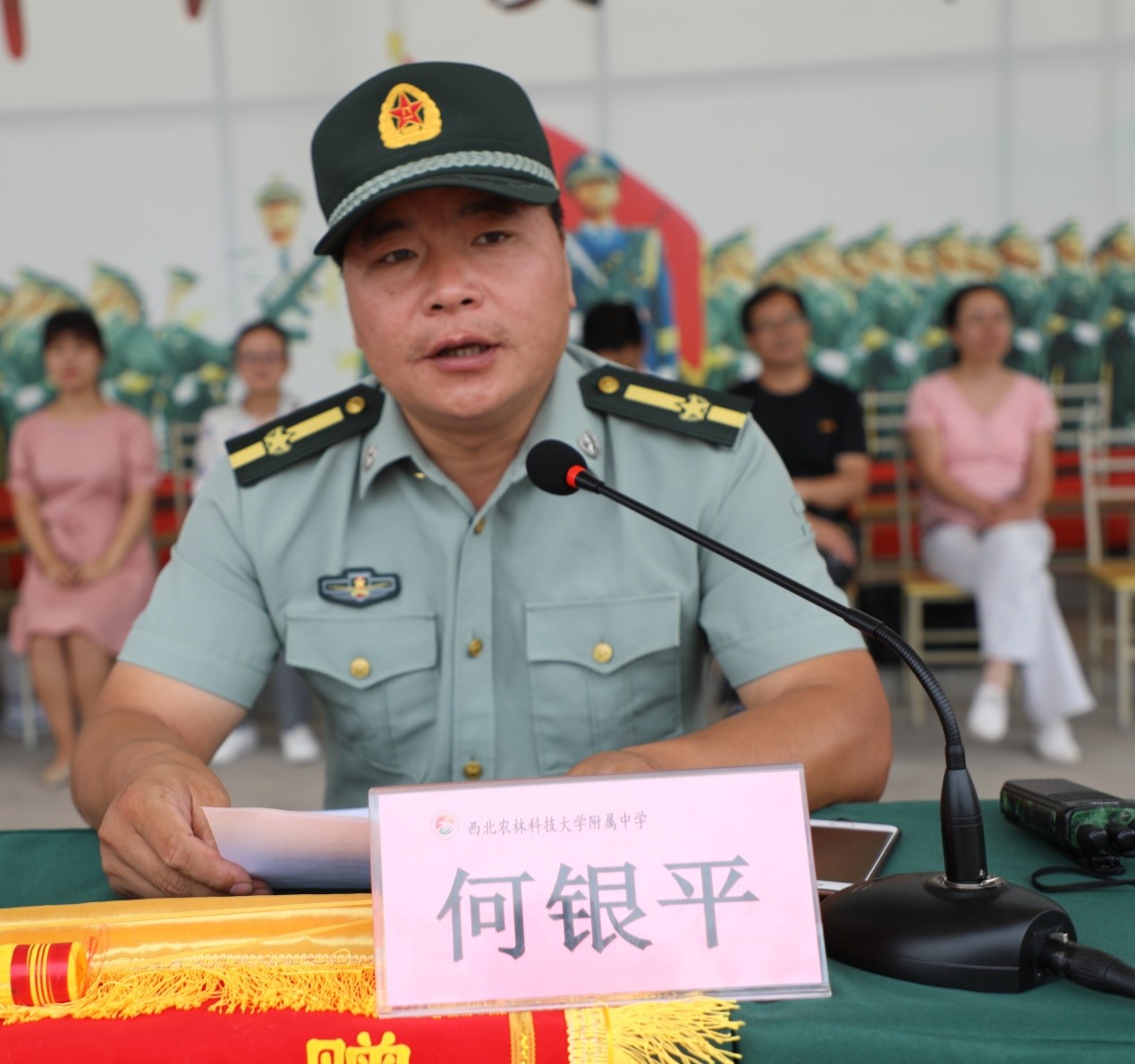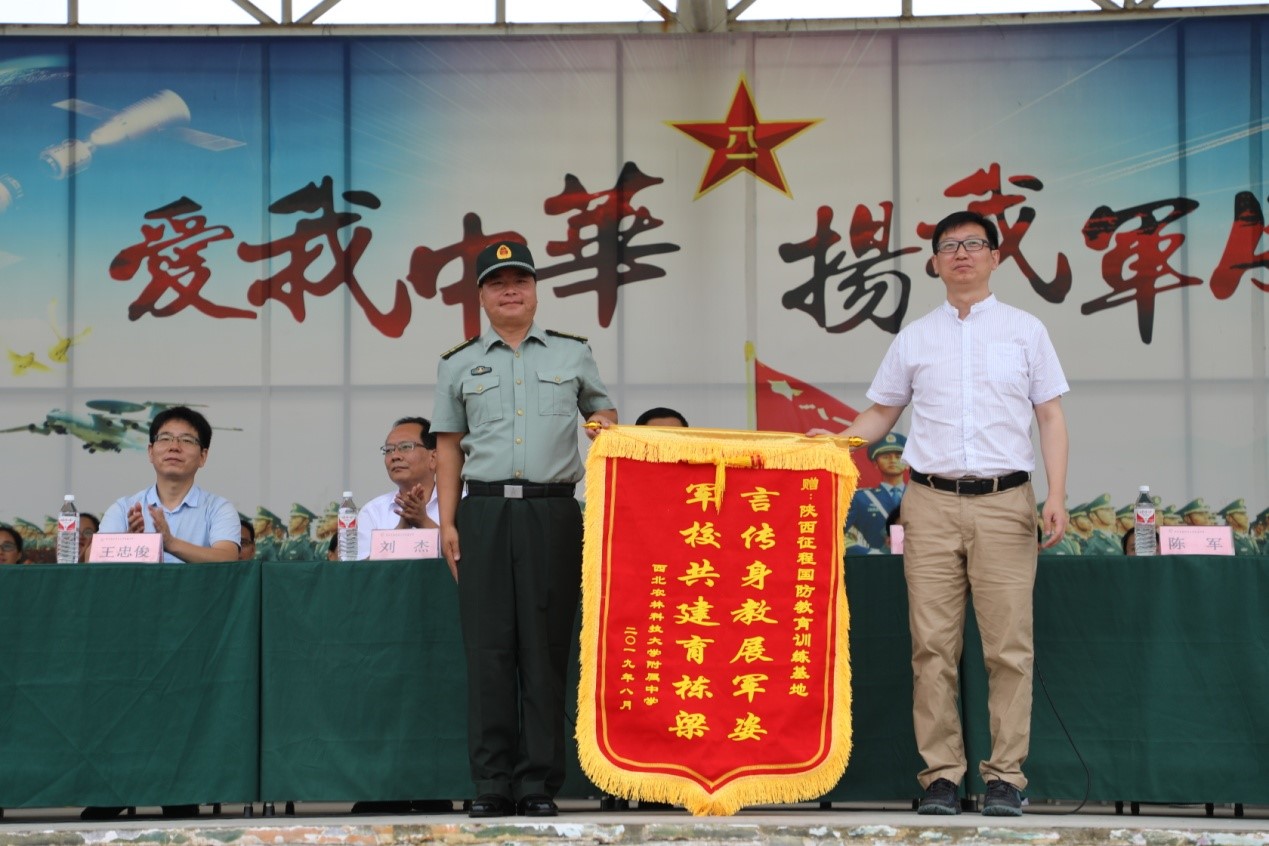 会上,国防教育基地何银平主任宣读了对优秀士兵及先进连队的表彰决定,我校校领导为获奖人员颁奖。陈军副校长代表我校为军训基地赠送锦旗。