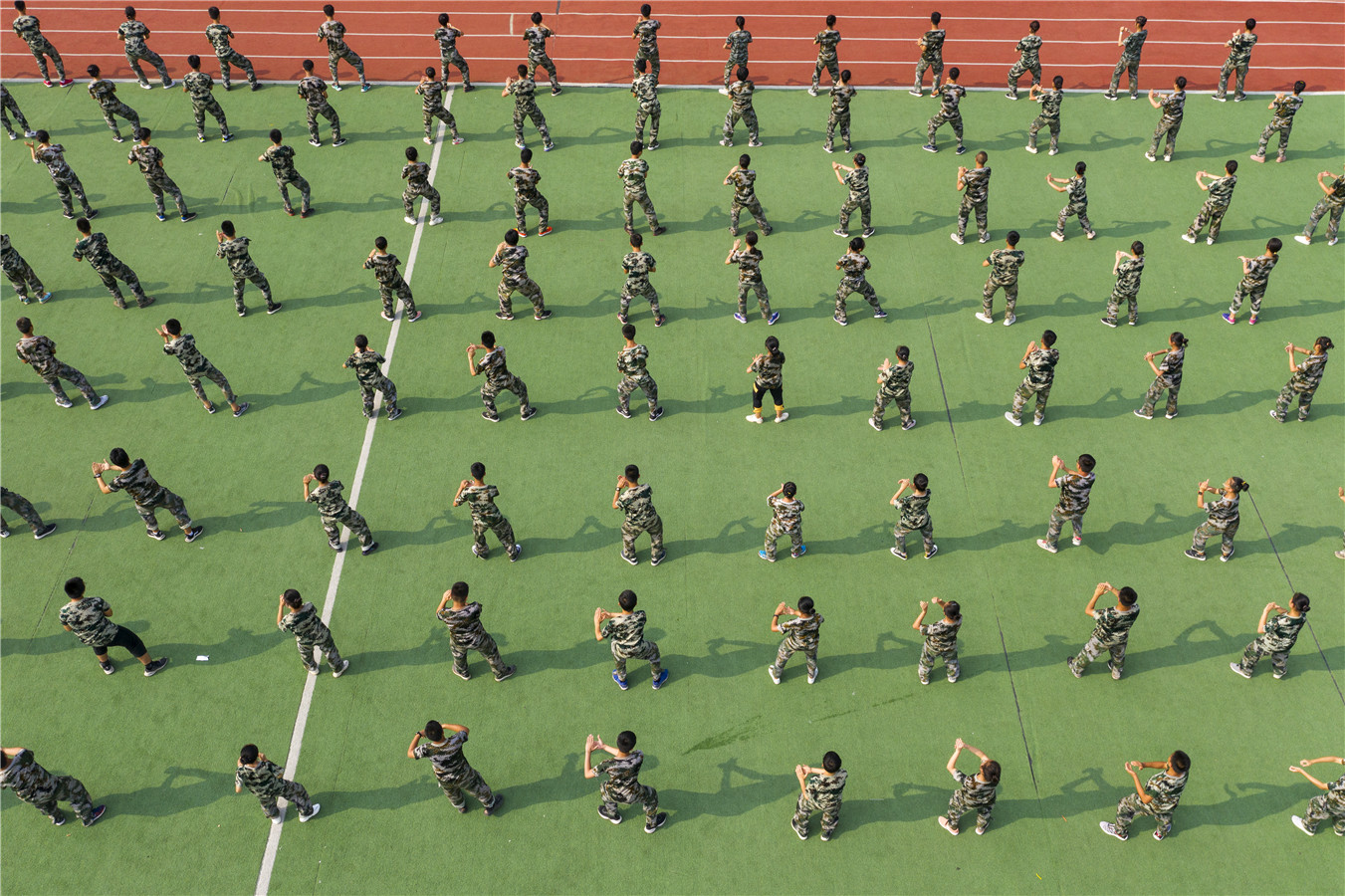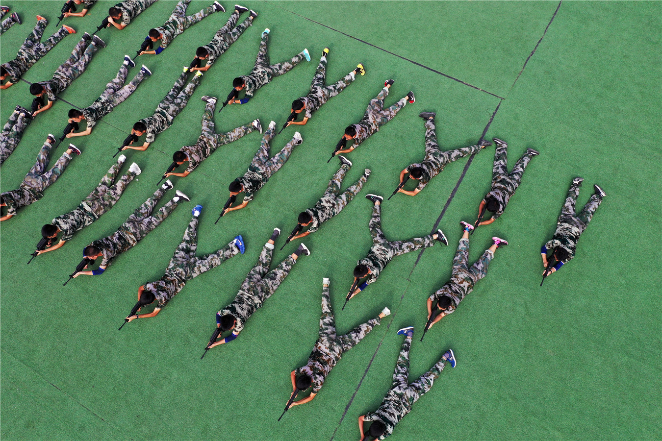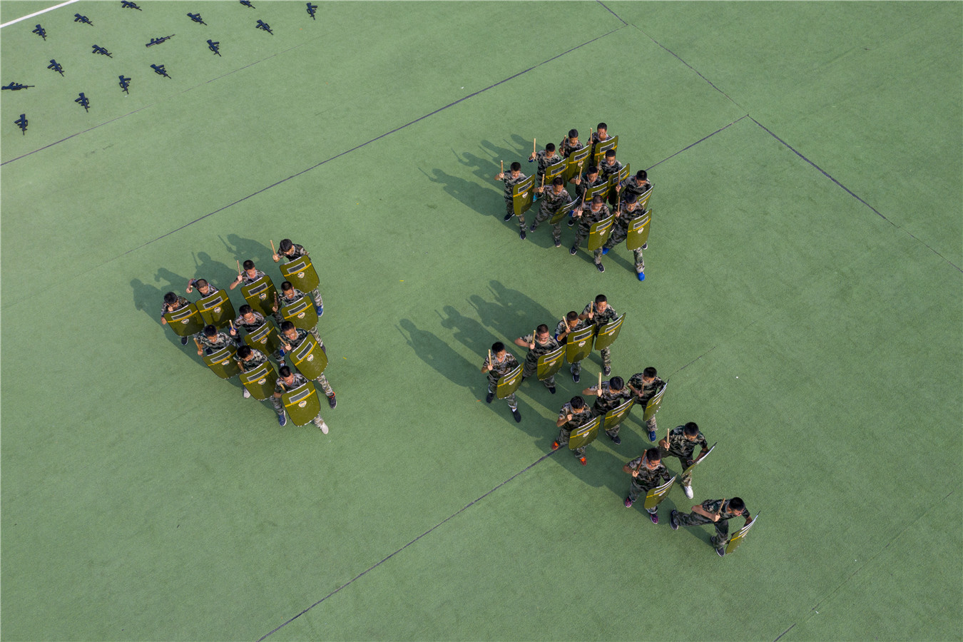 随后,军训新生们表演了队列、军体拳、国学操、战术、搏击操、三防演练、擒拿格斗舞旗操等军事科目,展示了7天的训练成果。军体拳、搏击操及擒拿格斗舞旗操精彩纷呈、虎虎生威,战术及三防演练模拟实战场景,动人心魄;国学操、队列表演动作整齐、集合迅速,展示了军人保家卫国、克敌制胜的过硬本领和无私无畏的精神,赢得了现场观众热烈的掌声。