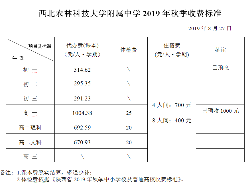 西北农林科技大学附属中学2019年秋季收费标准