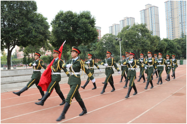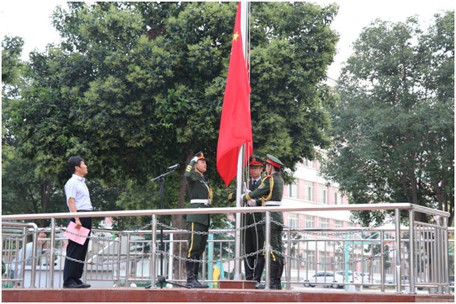 在雄壮的进行曲中,国旗班成员迈着矫健的步伐,护着鲜艳的五星红旗进场。伴随着庄严的《中华人民共和国国歌》,五星红旗冉冉升起,迎风飘扬。在场师生深怀对祖国的无限热爱和崇高敬意,高唱国歌,向国旗行注目礼。