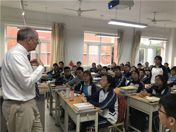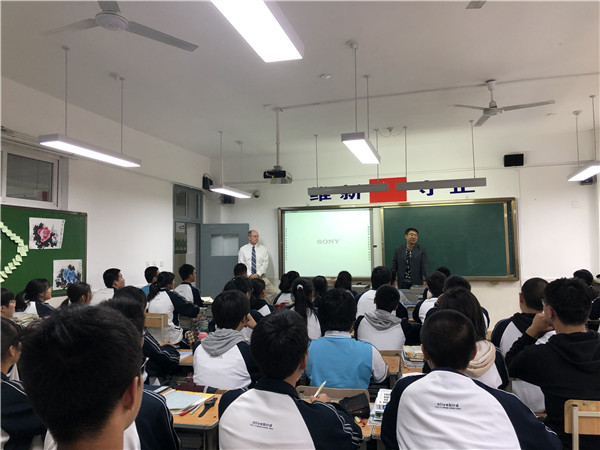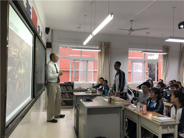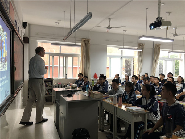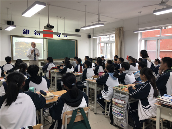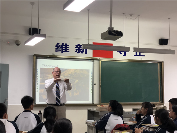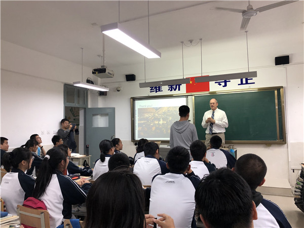 下午第三节课,高一1班的同学们怀着激动的心情,期待着这位外国友人的到来。邹宇锋副处长为同学们介绍了Jones教授的研究领域以及此次到访的目的。Jones教授用生动的图片和视频,介绍了自己的家庭、生长环境、美国著名的自然景观,以及在太空飞船上研究水与土壤之间的反应的实验,以及在没有地球引力的情况下,如何做运动以及饮食。