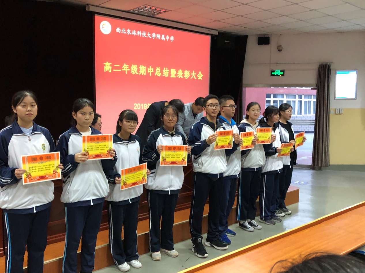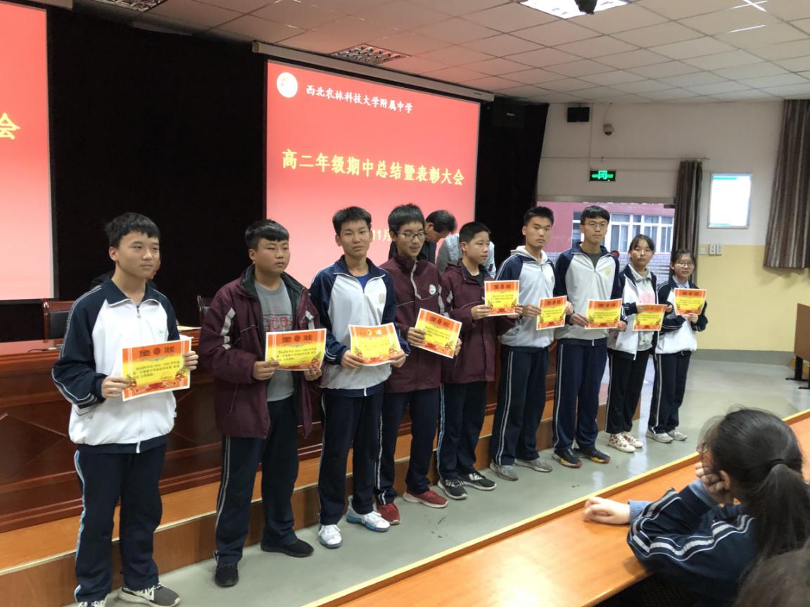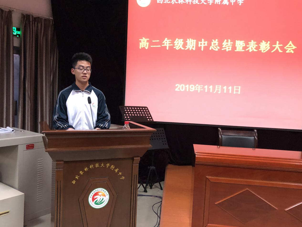 教育处徐恒明主任和年级组长王西武老师宣布了受表彰的学生名单,与会领导为获奖同学颁奖。此次期中考试中获得总分第一名的代君政同学作为优秀学生代表在大会上分享了自己的学习经验,认为在日常的学习中,要保持一个良好的心态;其次,要制定自己的学习目标,找到适合自己的学习方法。徐鹤瑞同学作为进步生代表分享了自己的学习经验,告诉同学们要确立适合自己的学习目标,分步完成;要在平常的学习中养成良好的学习习惯;注重知识的积累,定期复习,独立完成作业。只要脚踏实地就一定能获得进步。