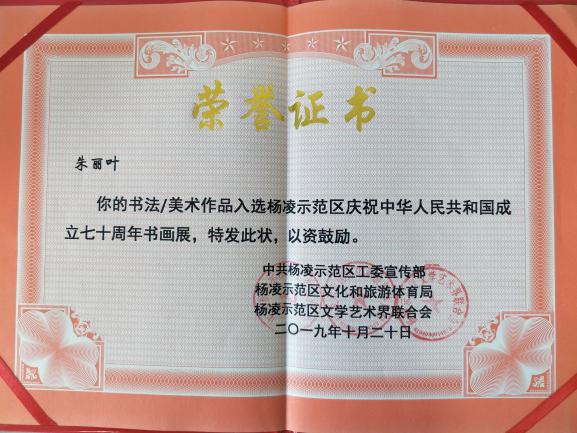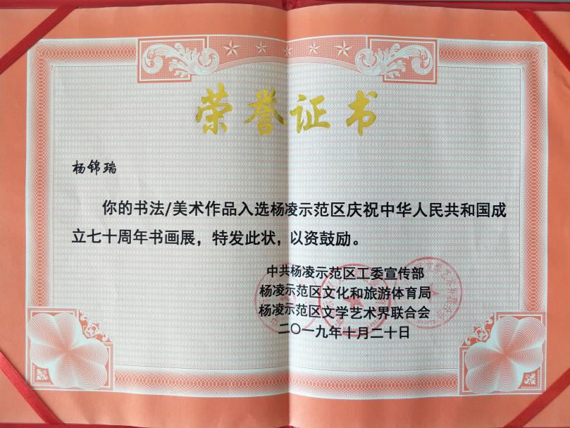 日前,杨凌示范区庆祝中华人民共和国成立七十周年书画展评选结果揭晓,我校初三6)班学生杨锦瑞、初二(8)班学生朱丽叶两名同学入选本次书画展并获得荣誉证书和奖品。